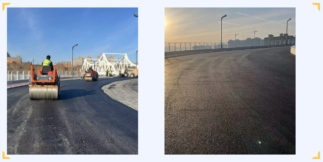 這座天橋?qū)掃_(dá) 11 米,核載為 20 噸。在整個(gè)建設(shè)進(jìn)程中,項(xiàng)目團(tuán)隊(duì)強(qiáng)化施工管理,憑借科學(xué)規(guī)劃、精心部署,有效克服低溫、橋體承重能力有限等不良影響,選取中午氣溫較高的時(shí)段集中攤鋪,并采用小型機(jī)械操作的方式開(kāi)展作業(yè),展現(xiàn)了團(tuán)隊(duì)的智慧和應(yīng)變能力。攤鋪過(guò)程中,大家緊密協(xié)作,各盡其責(zé)。他們先是把大料車中的瀝青倒入小料車,接著使用小型攤鋪機(jī)進(jìn)行作業(yè),通過(guò)單機(jī)多車道來(lái)攤鋪。與此同時(shí),為確保橋面不受損,啟用了兩臺(tái)震蕩小壓路機(jī)實(shí)施碾壓。寒氣逼人,卻沒(méi)有一個(gè)人喊苦叫累。當(dāng)攤鋪完成的路段逐漸延伸,所有人的眼中都流露出驕傲與欣慰。