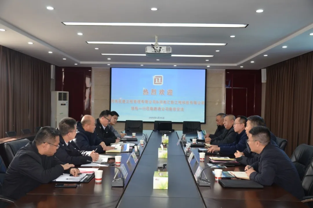 2025年1月15日下午,河南高建工程管理有限公司董事長(zhǎng)劉福順、河南匯新工程科技有限公司董事長(zhǎng)李大杰一行五人蒞臨公司進(jìn)行座談交流。路通公司董事長(zhǎng)胡香凱、總工程師李運(yùn)富、副總經(jīng)理馬博、李虎,工程分公司副經(jīng)理陸慶宇參加座談交流。