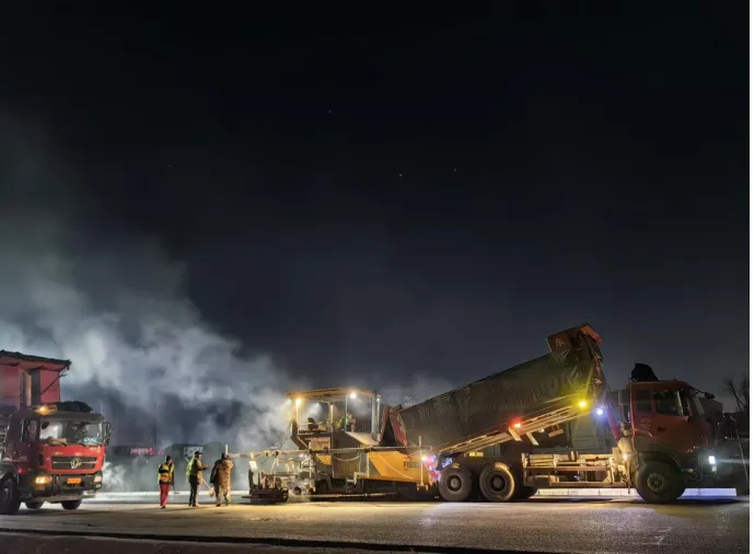 1月15日深夜,國道107線東移開封境(炎黃大道至許昌交界)新建工程的施工現(xiàn)場(chǎng)依舊燈火通明,一片繁忙的景象。大型攤鋪機(jī)有序地將滾燙的瀝青混合料均勻鋪展,壓路機(jī)往返穿梭,有條不紊地將路面壓實(shí)整平。在這寒意逼人的冬夜里,機(jī)械的轟鳴聲,施工人員忙碌的身影以及耀眼燈光相互交織,奏響了一曲勞動(dòng)者的“奮斗之歌”。